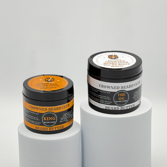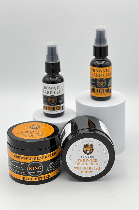 Introducing the "CROWNED ULTIMATE PACK": This is a OG Beard Oil and Beard Butter Pack, combined with the King Beard Oil and Beard Butter Pack. This powerful combination offers double the care and nourishment for your facial hair, ensuring it stays healthy, soft, and impeccably groomed.